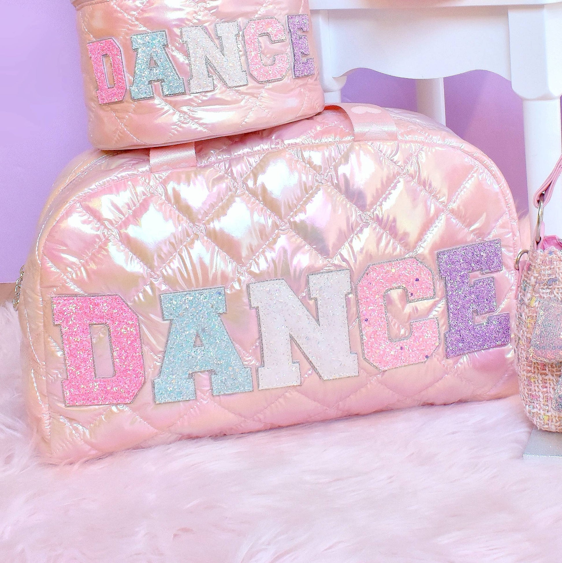Your little dancer will steal the spotlight with this light pink quilted medium sized duffle bag! Detailed we glitter 'DANCE' varsity letter applique patches, light pink heart-printed straps, and a sleek quilted puffy metallic design - it's the perfect bag to carry all of their Dance essentials!